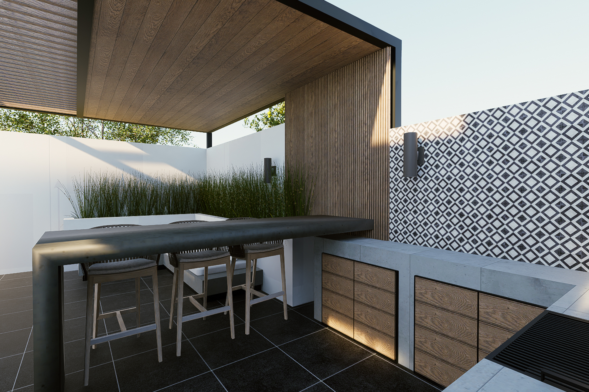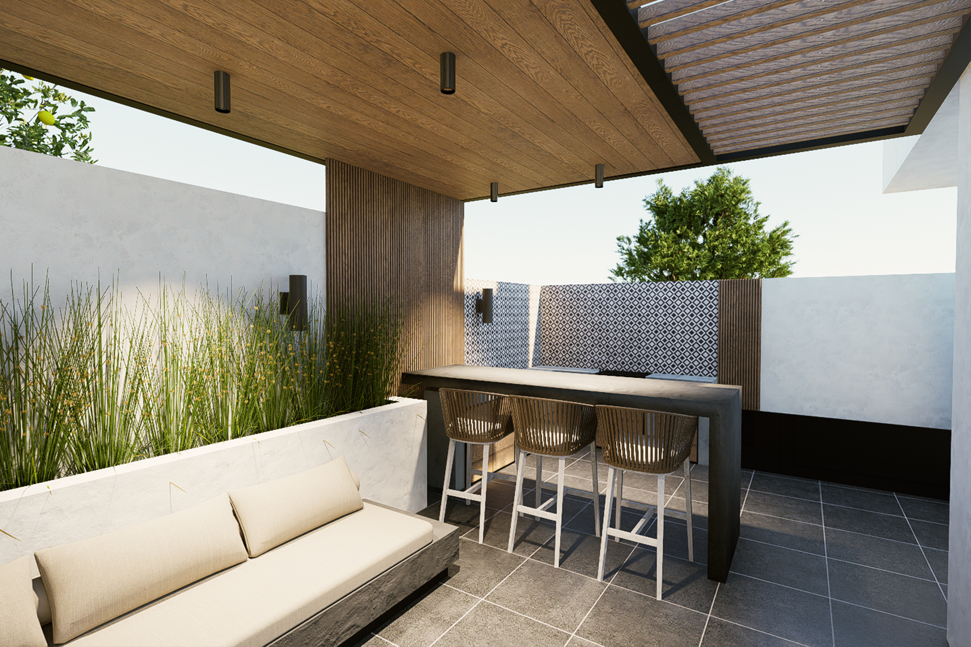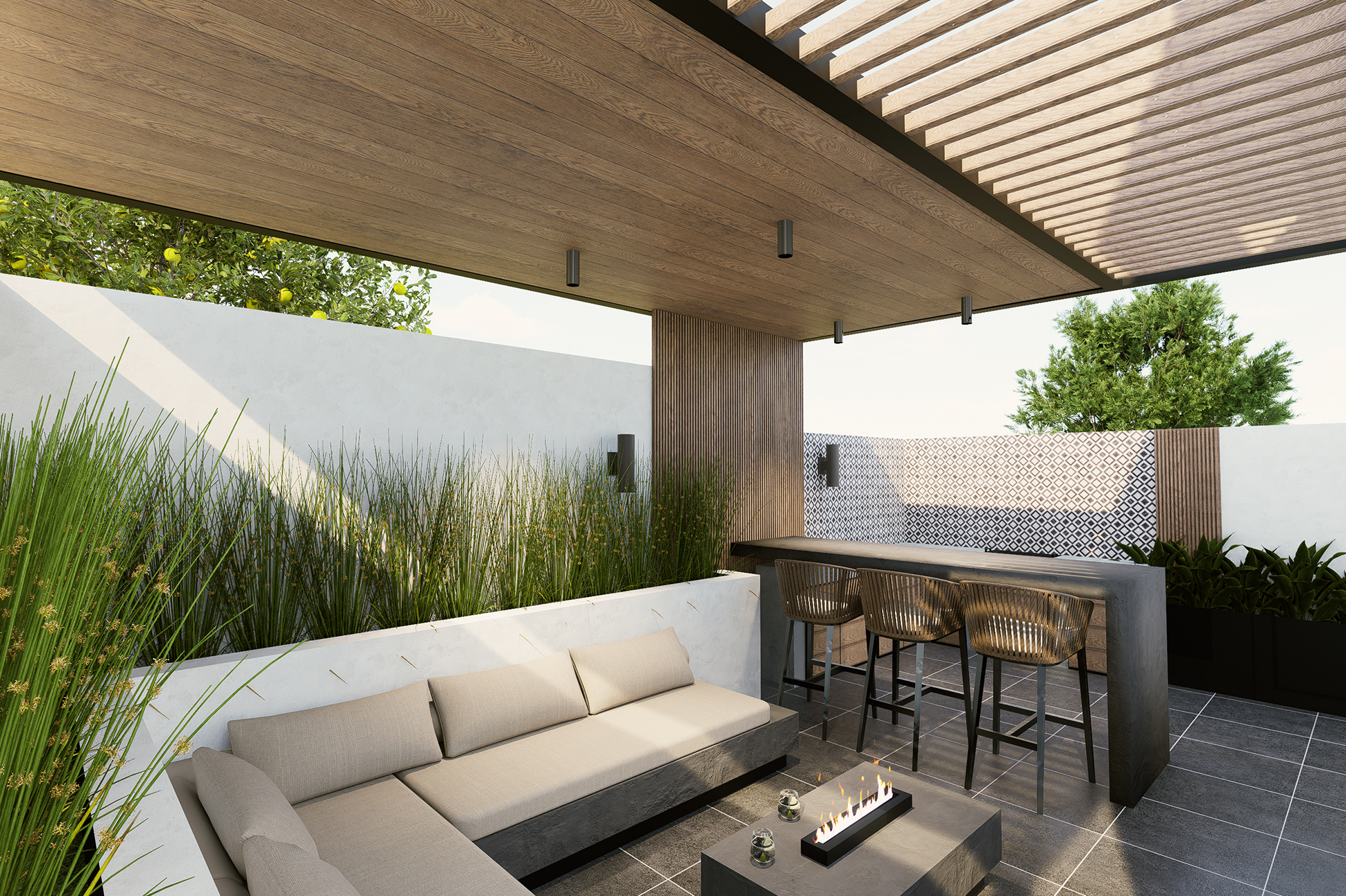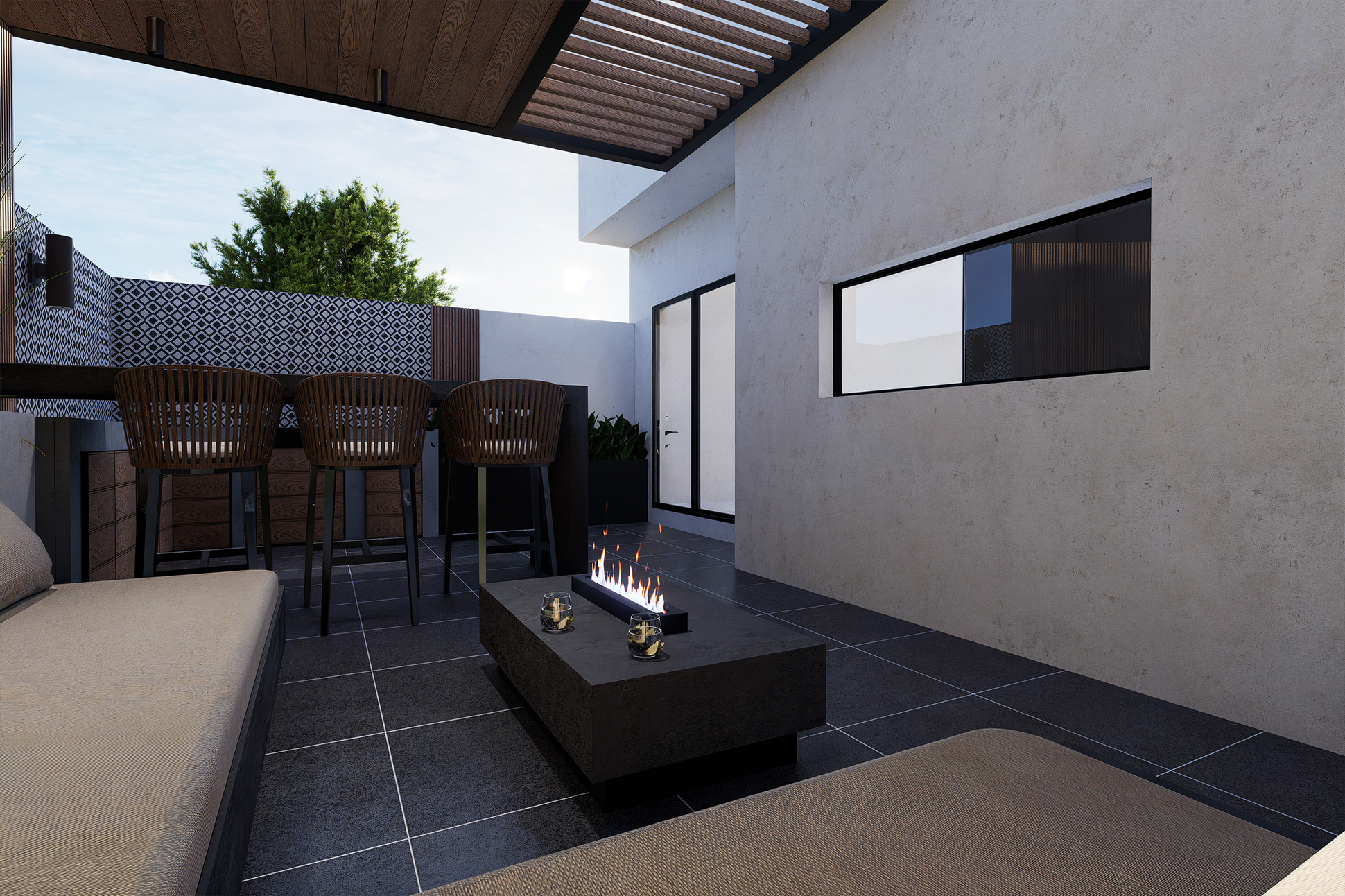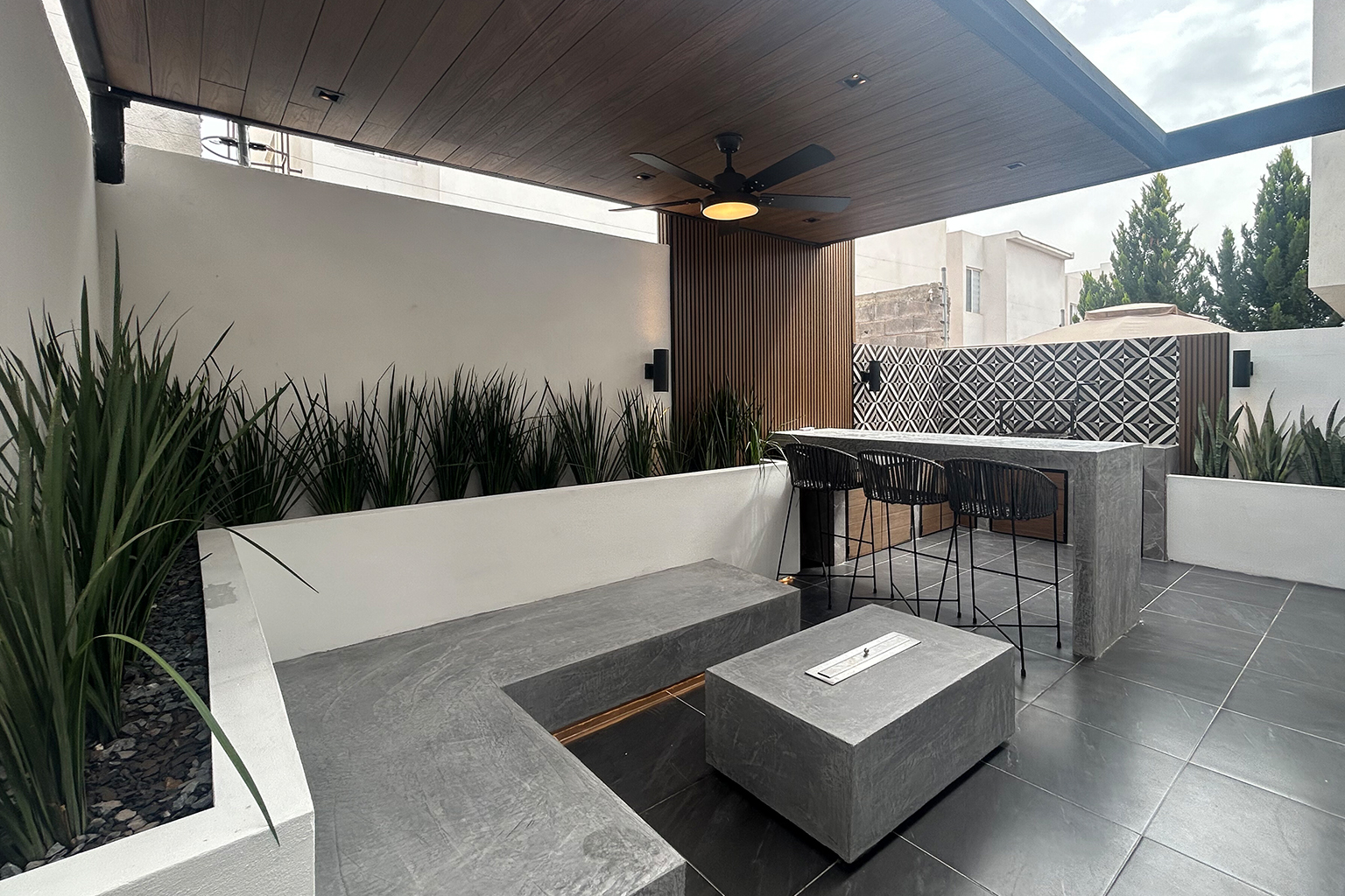 El diseño optimiza cada rincón mediante una distribución eficiente, mobiliario confortable y vegetación estratégicamente seleccionada, logrando un ambiente que invita al descanso, la interacción y la vida al aire libre.