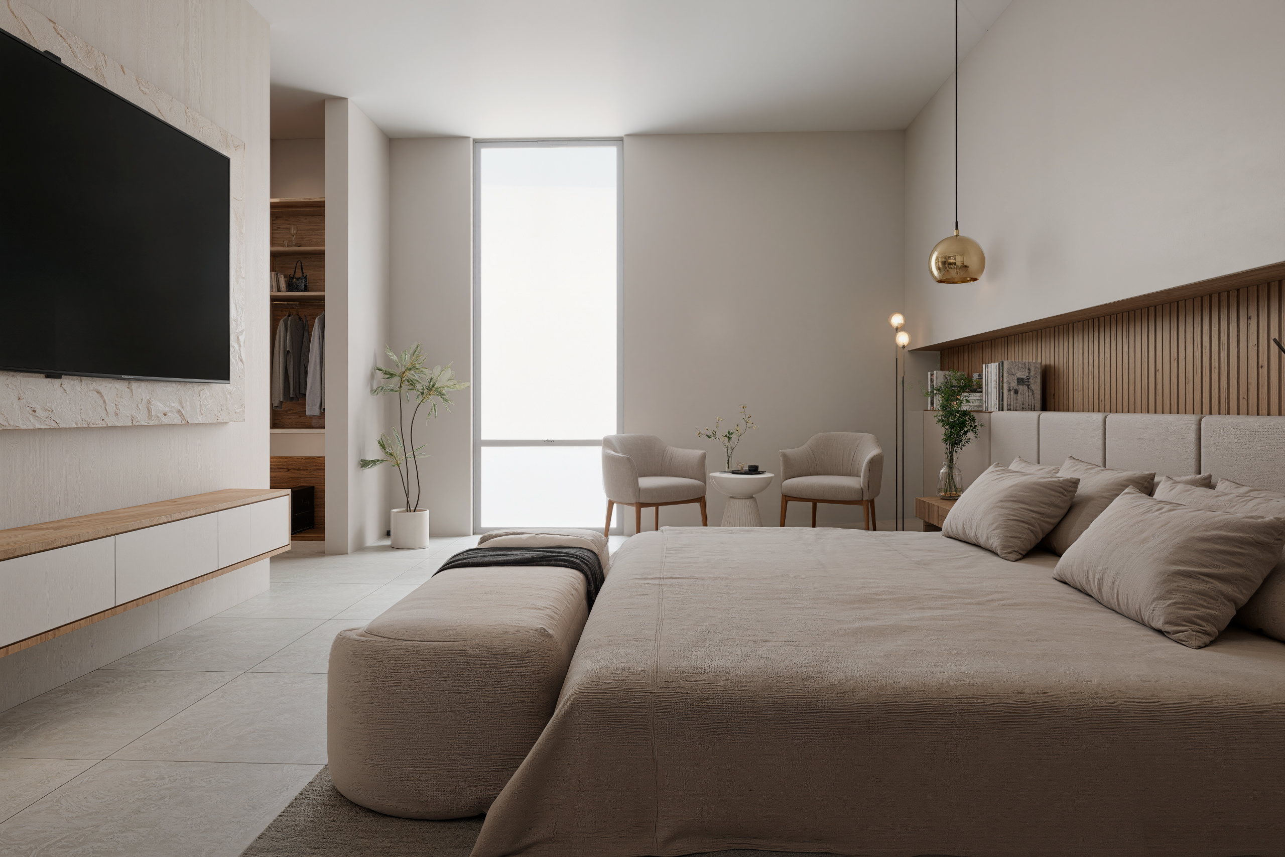 La fachada se resuelve mediante un juego de planos sólidos y elementos ligeros, enfatizando la horizontalidad a través de voladizos y balcones ajardinados. La combinación de revestimientos claros, celosías verticales y marcos oscuros genera profundidad visual, control solar y privacidad hacia el interior.